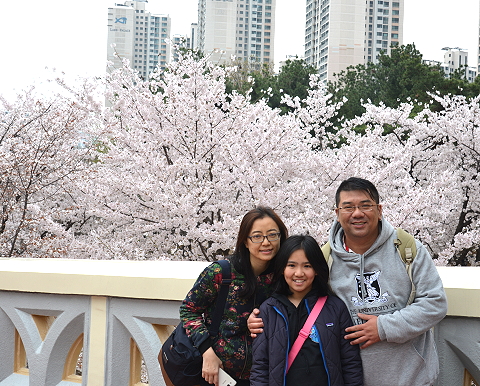 進入會場後, 先往戶外走走, 經過一條橋, 見到有櫻花, 要留影啦, 櫻花顏色不太鮮艷, 與日本的差很遠! |