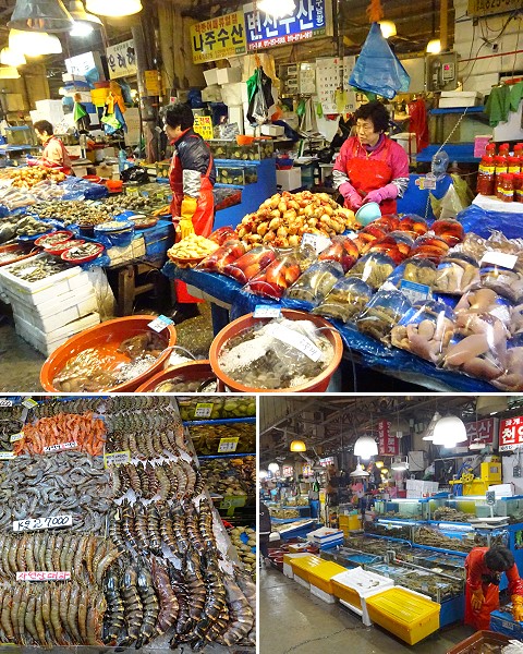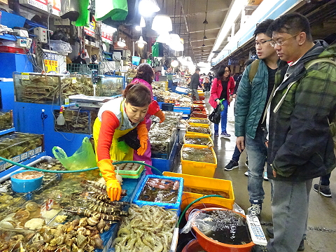 去到一間預備購海鮮的店, 被旁邊的大媽推走, 因為我們阻住佢檔野, 鬼殺咁嘈, 出口還算, 不要出手嘛, 韓國人就係咁質素 |