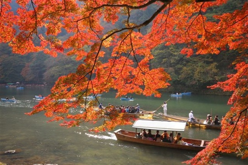 | 嵐山的幽靜風景加上楓紅, 彷佛是絕世美女 加上胭脂的點綴, 更添絕色, 尤其是透過大堰川映照出的紅葉 真是美得出色, 預計 11月上旨~11月下旬 |